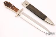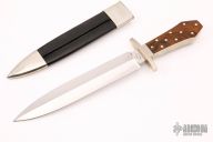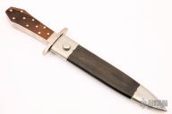 This Coffin Handle Dagger by Buster Warenski features a mirror polished double edged blade with .246" blade stock and 1.494" blade depth, hidden tang construction. The handle has a nickel silver double guard, wood grip with nickel silver pins and nickel silver frame. Comes with a nickel silver and black leather scabbard. Has a few light scratches, otherwise excellent condition.