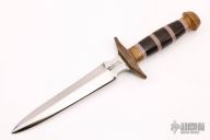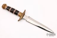 This Dagger by John Nelson Cooper features a satin finished double edged blade with .371" blade stock and 1.232" blade depth, hidden tang construction. The handle has a brass guard and butt, black canvas micarta grip with red/white/black spacers. Has some patina, otherwise excellent condition.