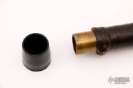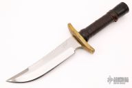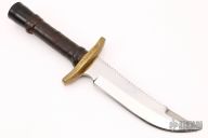This Survival Bowie by John Nelson Cooper features a mirror polished blade with sawteeth and sharpened top edge, .358" blade stock and 1.668" blade depth, hidden tang construction. The handle has a brass guard and hollow handle with leather wrapped grip, has a crutch tip butt cap. Has some light scratches, otherwise excellent condition. The guard is stamped "G.M.S. PAPAC"