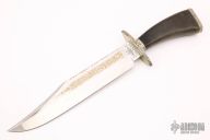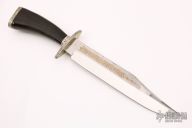 This bowie by Wilkinson Sword features a mirror polished blade with gold etching and fileworked spine, .228" blade stock and 2.062" blade depth, hidden tang construction. The handle has a nickel silver guard and buffalo horn handle, nickel silver butt. Has some scratches and patina, otherwise good condition.