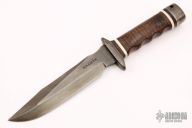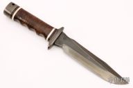 This S1 Bowie (Vietnam 5th Special Forces Group) has a black clip point blade with hidden tang and double guard. Blade width is just under 1/4", depth 1-1/4". Handle is contoured stacked leather with white spacers, black coated steel butt cap and lanyard hole. Comes with original black leather sheath. Very Rare. Blade is marked "SOA (LM) 318" on the presentation side. The non-presentation side has the Special Forces crest on the ricasso and "VIETNAM 5th Special Forces Group" on the swedge.  Has a few light scratches, otherwise excellent Condition.