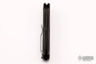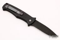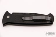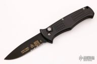 This Auto SEAR side opening auto by Al Mar Knives features a black blade with false top edge and partial serrations. The handle is T6 black anodized aluminum with a black stainless steel tip up clip. The action is strong and lock-up is solid. Light scratches are visible on the blade and handle otherwise the knife is in excellent condition.