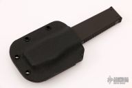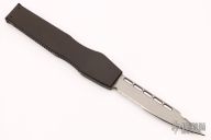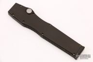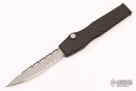 This HALO II is the clip point blade model in the HALO series by Microtech Knives. Single action, side positioned button for firing. Closure via a reverse charging handle in the rear of the frame. Contoured frame grip with milled ribbing on the frame spine and belly. This Halo II has a bead blasted clip point blade. Dated 04/98. Kydex belt sheath. Has some light scuffs, otherwise excellent condition.