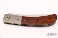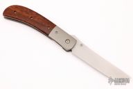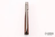 This linerlock by James J McGovern features a chisel ground bead blasted tanto blade with single checkered thumbstud. The handle has dovetailed and bead blasted titanium bolsters and liners with snakewood scales and a black linen micarta backspacer. Nice blade seating. Has a few light scuffs, otherwise excellent condition.