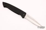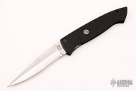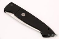 This automatic is a collaboration between Walter Brend and Woodard knives. The Brend flag emblem is on the blade face side and Woodard's WK (Woodard Knives) USA shield is on the frame. The blade is hand-ground by Walter Brend and hand rub satin finished with a partially serrated edge. Black aluminum frame. Strong coil-spring automatic action. The frame has some light scuffs, otherwise excellent condition.