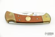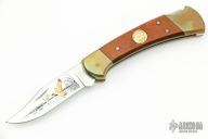 Ducks Unlimited 50th Anniversary commemorative Buck model 112. Beautiful etched blade with Ducks Unlimited medallion inlay in wood handle. Has some patina, otherwise excellent condition. Includes the original display box.