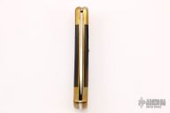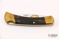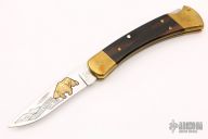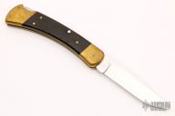This Model 426 by Buck features a laser engraved blade with nail nick. The handle has a brass frame with wood scales. Comes with original box. Has a little patina, otherwise excellent condition.
