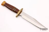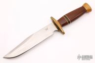 This Fighter by John Nelson Cooper features a satin finished clip point blade with a sharpened top edge, .180" blade stock and 1.429" blade depth, hidden tang construction. The handle has a brass guard, brown canvas micarta grip with brass and canvas micarta spacers and a brass butt. Has some light scratches, otherwise excellent condition.