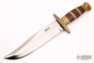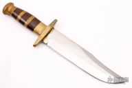 This knife by John Nelson Cooper features a satin finished blade with a sharpened top edge, .241" blade stock and 1.836" blade depth, hidden tang construction. The handle has a brass guard and butt, brown canvas micarta grip with brass spacers. Has some scratches and light oxidation/patina, otherwise excellent condition.
