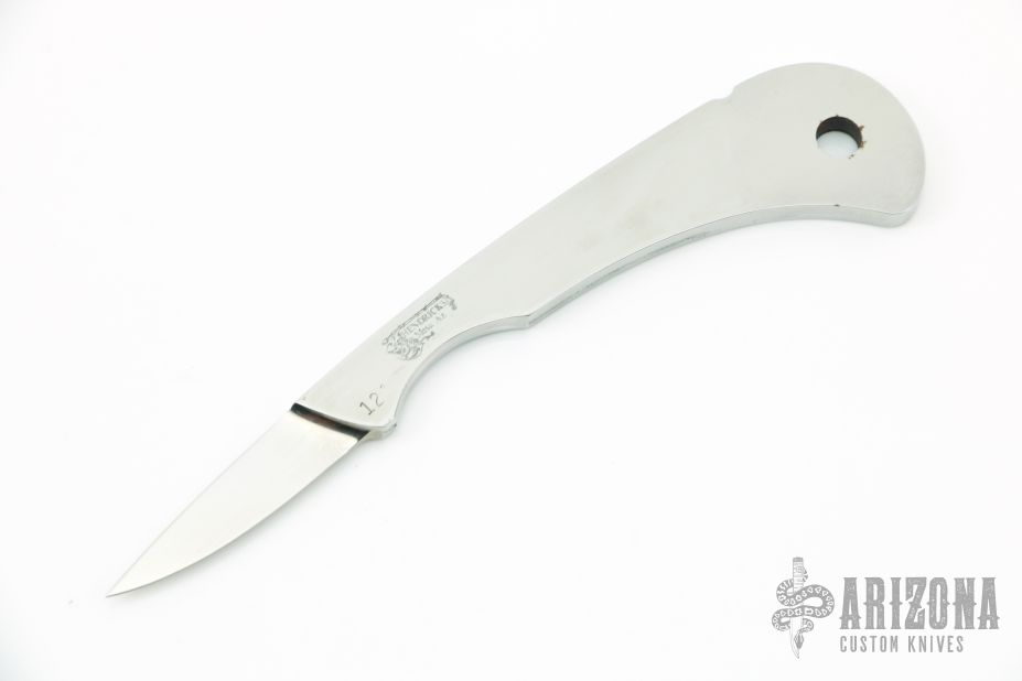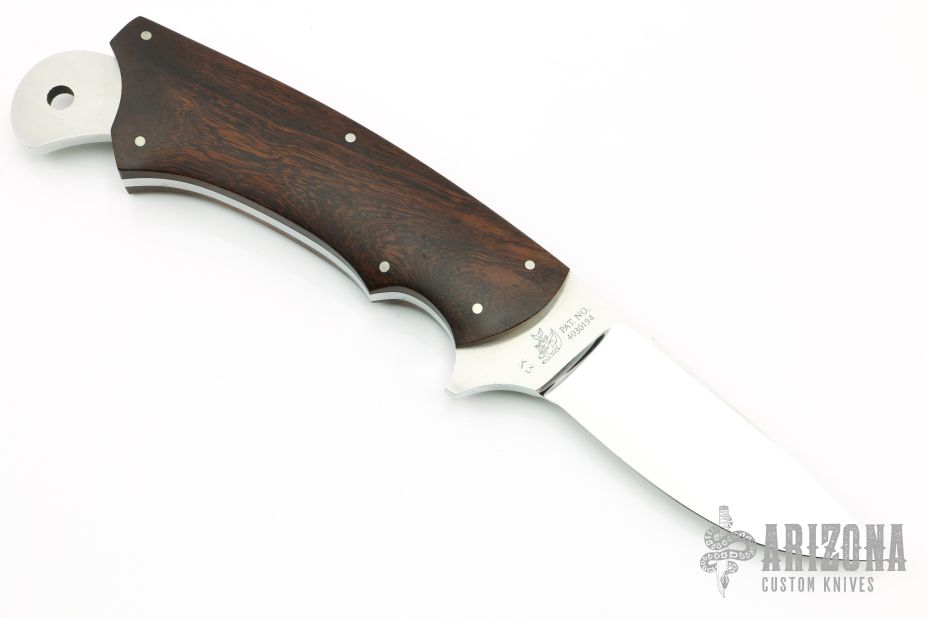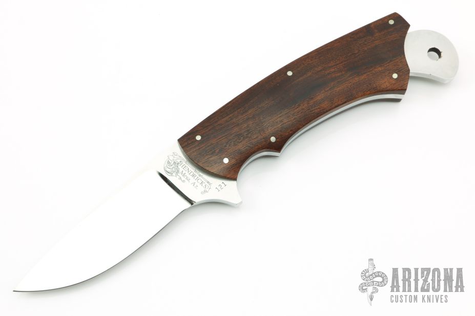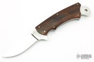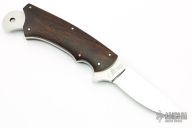This Kangaroo knife set by Lorenzo Hendricks features a mirror finished blade with .174" blade stock and 1.088" blade depth, full tang construction. The handle has ironwood scales and nickel silver pins. Knife includes a second blade that fits nicely in rear of handle. Second blade has a hand rub satin finished blade and handle. This set is numbered "121" on both blades. Has a few light scratches, otherwise excellent condition.