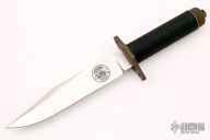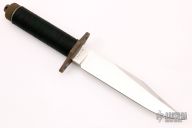 This Vietnam Commemorative Knife by Jimmy Lile features a clip point satin finished blade with Vietnam Commemorative artwork etched on the blade. Presentation side ricasso has the "Lile" maker's mark while the B side says "04 of 100". The handle is comprised of brass guard with holes for lashing and black wrapped nylon cord over a hollow stainless steel tube. Pommel features a brass screw off cap. Excellent condition.