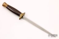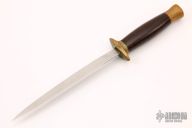 This Dagger by Victor Anselmo (who worked under John N Cooper) features a satin finished triangle dagger blade with .300" blade stock and blade depth, hidden tang construction. The handle has brass guard and butt with brown canvas micarta grip. Excellent condition.