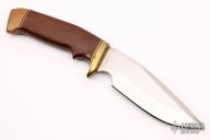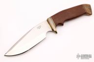 This early knife by Jody Samson features a high satin finished blade with notched thumbrest, .194" blade stock and 1.753" blade depth, hidden tang construction. The handle has brass guard and butt with a brown canvas micarta grip with brass/black spacers. Has a little patina, otherwise excellent condition.