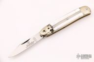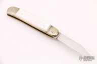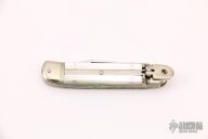 This leverlock folder (the spring has been removed, and it is no longer an auto) by Hubertus features a clip point blade, nickel silver double bolsters, mother-of-pearl scales, and brass liners and pins. Has some light scratches otherwise good condition.