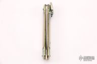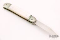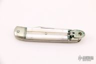 This leverlock folder (the spring has been removed, and it is no longer an auto) by Hubertus features a clip point blade, nickel silver double bolsters, mother-of-pearl scales, and brass liners and pins. Has some light scratches otherwise good condition.