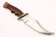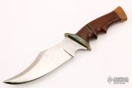 This Bowie by Victor Anselmo features a satin finished blade with sharpened top edge, .348" blade stock and 2.021" blade depth, hidden tang construction with brass guard and butt, and a brown canvas micarta grip with brass spacers. Has a couple light scratches, otherwise excellent condition.