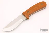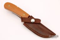 This hunter by Victor Anselmo features a mirror finished drop point blade with .114" blade stock and 1.189" blade depth, full tang construction with vintage paper micarta scales with brass liners. Has a chip in one of the scales, otherwise excellent condition. Comes with a brown leather sheath. Dated 1975