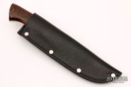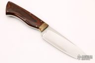 This hunter by Victor Anselmo features a mirror finished drop point blade with .185" blade stock and 1.337" blade depth, full tang construction. The handle has brass bolsters and laminated wood scales with brass pins. Has some light patina, otherwise excellent condition. Comes with a black leather sheath. Dated 1978