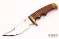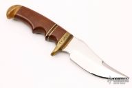 This Skinner by John Nelson Cooper features a mirror polished blade with a sharpened top edge and notched thumbrest, .187" blade stock and 1.507" blade depth, hidden tang construction. The handle has brass bolsters, spacers and butt cap with brown canvas micarta handle. Has some light scratches and patina, otherwise excellent condition. Has "T.P. DAVIS" stamped on the guard.