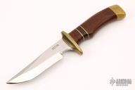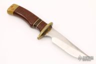 This knife by Victor Anselmo features a satin finished blade with .233" blade stock and 1.069" blade depth, hidden tang construction. The handle has brass bolsters and butt with a brown canvas micarta grip and brass spacers. Has some light patina, otherwise excellent condition.