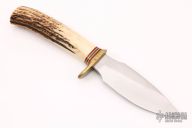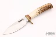 The Model 11 is the original drop-point blade. Designed by Tommy Thompson, noted Alaskan guide, in 1952 for big-game skinning, with point dropped below top of blade to prevent cutting too deeply through skins when used point first. This knife has a carbon steel blade with notched thumbrest, .218" blade stock and 1.329" blade depth, hidden tang construction. The handle has a brass guard, stag grip, and red/white/blue spacers. Has some light patina, otherwise excellent condition.