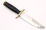 This combat fixed blade by Bianchi features a spear point mirror polished blade with serrated and sharpened top edge. 3/16" blade stock and 1 3/8" blade depth, hidden tang construction. The handle has a brass S-Guard, black composite handle that is hollow, and a removable brass butt cap. #0169. Has some patina, otherwise excellent condition.