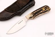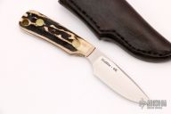 This knife by AG Russell Shopmade features a satin finished blade with .119" blade stock and .859" blade depth, hidden/frame tang construction. The handle has stag scales with red liners, brass frame. Comes with a brown leather sheath. Excellent condition.