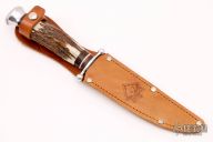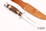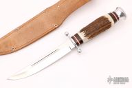 This Hunter by Puma Knives features a mirror finished blade with fullers, .135" blade stock and .758" blade depth, hidden tang construction. The handle has an aluminum guard and butt with stag grip with brown/red/white spacers. Includes original leather sheath. Excellent Condition. Made in 1980s.