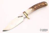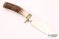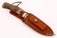 This knife was an AG Russell Special and is #382. Has a satin finished carbon steel blade with a notched thumbrest, .201" blade stock and 1.388" blade depth, hidden tang construction. The handle has a brass guard and butt with a popcorn stag grip, black/brass spacers. Comes with a black leather sheath. Excellent condition.