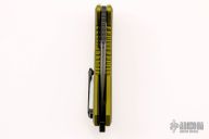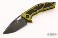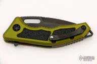 This Medusa Manual by Heretic Knives features a black tanto blade with false top edge, notched thumbrest and flipper. The handle has a green aluminum frame with checkered push button, black backspacer and a tip up stainless steel clip with ceramic ball. Comes with original box and drawstring bag. S/N 0032.  Excellent Condition.