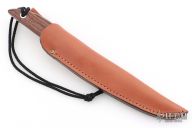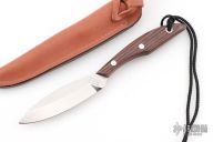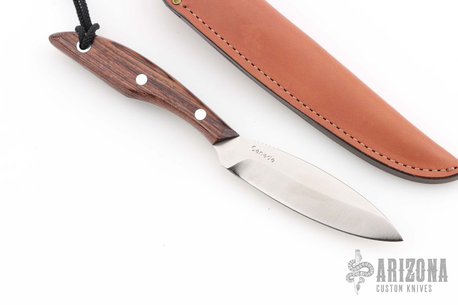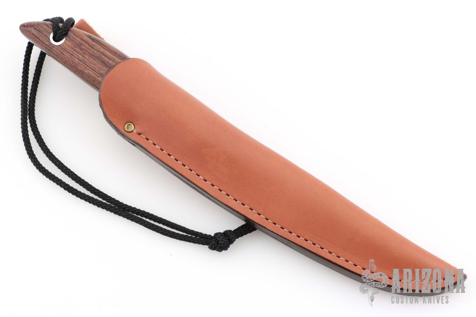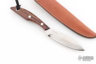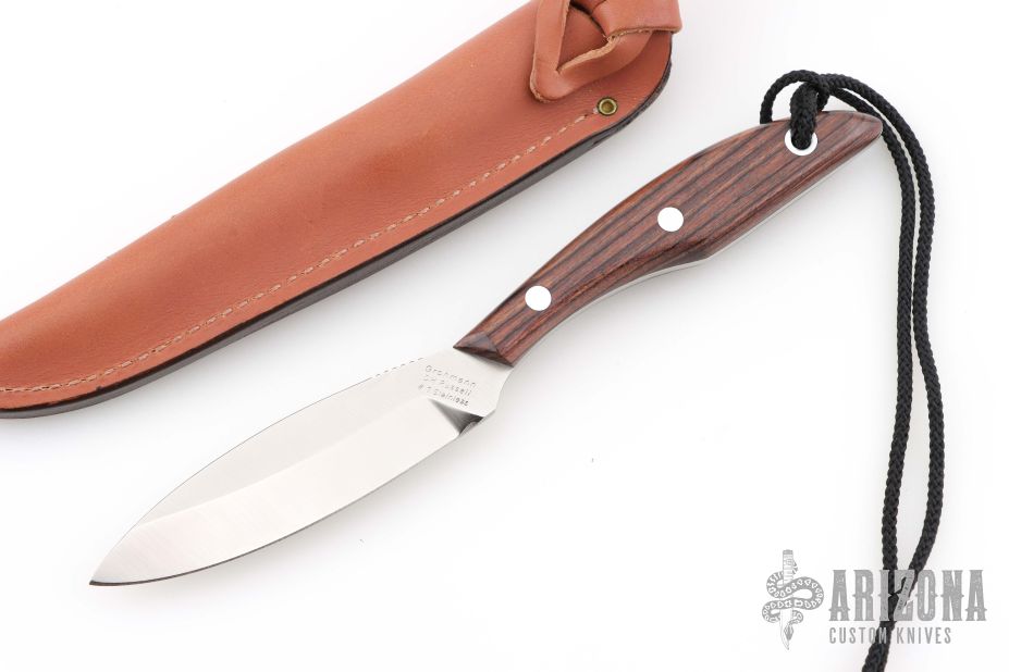 The belt Knife, by Grohmann Knives, features a drop point blade with a notched thumbrest and a full tang construction, .117" Blade Stock .986" Blade Depth. The handle is composed of wood scales. Includes a brown leather sheath. Excellent Condition.