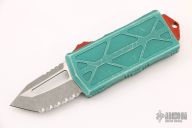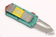 This Microtech Exocet features an apocalyptic finished tanto blade with serrations. The handle has a distressed green aluminum handle and a stainless clip that doubles as a money clip dated 03/2021 S/N 3941. Comes with original box and papers. Excellent Condition.