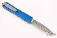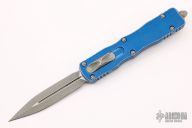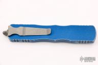 This Dirac Delta OTF automatic by Microtech features a D/E Apocalyptic finished blade with a standard edges. The handle is distressed OD blue aluminum with stainless steel tip down clip and Apocalyptic finished hardware. Serial number 4194 and dated 03/2021. Comes with original box and papers. Excellent Condition.