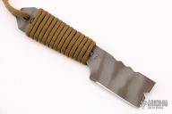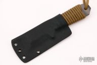 This Bug Out Blade has a tiger stripe finish, V-notch, and cord wrap. Has a few light scuffs otherwise excellent condition. Comes with Kydex sheath.
