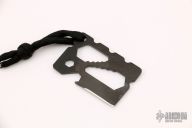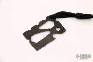 "Made of CPM S30V, this mini credit card tool features six SAE wrench sizes: 1/4, 5/16, 3/8, 7/16, 1/2, and 9/16. Also includes five Metric wrench sizes: 6, 8, 10, 12, and 14mm. Bottle opener doubles as a 5/16 wrench. A 1/4 hex driver opening and screwdriver tip is also included as well as a small cutting edge." DLC finish. Excellent condition. Comes with original bag and card. Comes with a custom kydex sheath.
