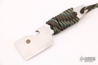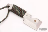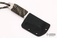 This Prymera by JDR Knife and tool features a chisel ground satin finished blade with a moonglow inlay, .149" blade stock and 1" blade depth, 1.286" blade depth. Includes bottle opener, flat screwdriver/pry surface, and notched thumbrest. Paracord wrapped handle. Includes a kydex sheath. Excellent condition.