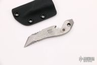 This Barracuda by JDR Knife and Tool features a chisel ground blade with notched thumb and finger rests, moonglow insert, bottle opener. Comes with a kydex sheath. Excellent condition.