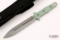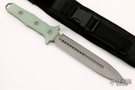 This Nephilim by Heretic Knives features a double-edged and Battle-worn blade, .201" blade stock and 1.167" blade depth, full tang construction. The handle has jade G-10 scales with battleworn hardware, lanyard hole at the butt. Comes with a black nylon sheath.  Comes with original box. Excellent Condition.