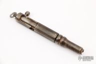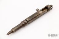 This Bolt Action Pen from Hidetoshi Nakayama features a multi-finish grip and shaft, bolt action locking mechanism, and lanyard ring. Refillable - takes Caran d'Ache of Switzerland, Giant Cartridge Goliath, 8428.000 Medium Black refills. Excellent condition. Comes with a leather pouch.