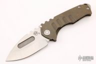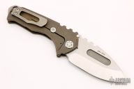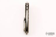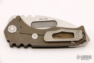 This Praetorian Genesis T by Medford Knife and Tool features a tumbled drop point style blade with fullers and notched thumbrest. The handle has an anodized titanium frame with titanium tip up pocket clip and a D2 backspacer/glass breaker with lanyard bail.  Includes original box, papers and vault style case. Excellent condition.