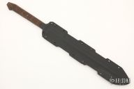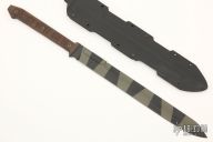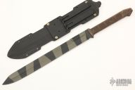 This Sword by John Gage has a black and green tiger stripe finished blade with a sharpened top edge and notched thumbrest, .240" blade stock and 1.733" blade depth, full tang construction. The handle has brown canvas micarta scales. Comes with a kydex sheath. Excellent condition.