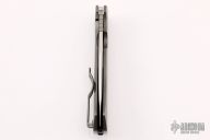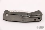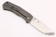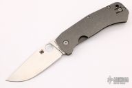 This Slysz Bowie by Spyderco features a tumble finished blade with notched thumbrest and thumbhole. The handle has a tumble finished titanium frame with notched black G-10 backspacer and tip up, left or right reversible clip. Nice detent, lockup and blade seating. Excellent Condition. Comes with original box and papers.
