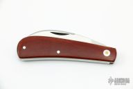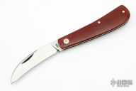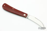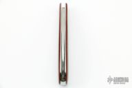 This okra knife features a satin finish hawkbill style blade with a single nail nick.  The handle features red micarta covers over stainless steel liners.  Half-Stop flush in all positions. Light scratches are visible on the blade otherwise the knife is in excellent condition.  Includes a padded zippered case.
