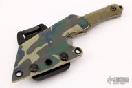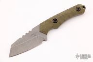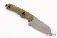 This Midsize Raptor by Tactical Pterodactyl features a sheepsfoot Magnacut blade with a notched thumbrest, .149" blade stock and 1.142" blade depth, full tang construction. The handle has green G-10 scales. Comes with a kydex sheath and COA. Excellent condition.