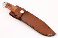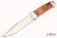 This Integral Chute Knife by AG Russell features a satin finished blade with false top edge, .201" blade stock and 1.159" blade depth, full integral tapered tang construction. The handle has fluted integral bolsters and butt with thuya burl wood scales and stainless steel pins. Comes with a brown leather sheath and original box. Excellent condition.