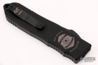 The Recon-Elite Double-Action Automatic has an overall length of 9.75” and a closed length of 5.625"". The 4.1" fine edge, Tanto-point blade is made of all Black finished ELMAX stainless steel. The dual, ventilated blood grooves on the blade allow for lightning fast deployment. The Black Type lll Hardcoat Anodized Aluminum handle is has top and bottom jimping for a non-slip grip. The black thumb slide rides on a stainless steel plate with ceramic balls to reduce friction. It features all black hardware with a black, serial numbered, reversible for right, or left hand pocket clip for tip-down carry. It also has a lanyard hole and hardened glass breaker tip.