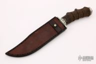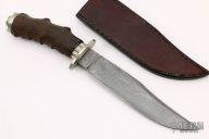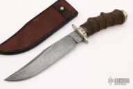 This knife by Steve Mullin features a Damascus blade with a sharpened top edge, .218" blade stock and 1.348" blade depth, hidden tang construction. The handle has a fileworked nickel silver guard, collar and butt with an impala horn grip. Comes with a brown leather sheath. Excellent condition.