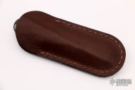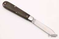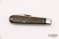 This slipjoint by Great Eastern Cutlery features a satin finished drop point blade with a single nail nick. The handle has stainless bolsters, green linen micarta covers, stainless steel liners and spring. Has half stop. Comes with a brown leather slip sheath. Excellent condition.