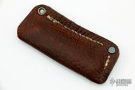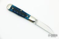 This Pemberton by Great Eastern Cutlery features a satin finished blade with nail nick. The handle has nickel silver bolsters, escutcheon, blue jigged bone covers, brass pins and liners with stainless spring. Has half-stop. Excellent condition. Comes with a brown leather slip sheath.
