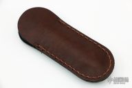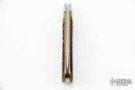 This slipjoint by Great Eastern Cutlery features a satin finished drop point blade with a single nail nick. The handle has stainless bolsters, yellow jigged bone covers, stainless steel liners and spring. Has half stop. Comes with a brown leather slip sheath. Excellent condition.